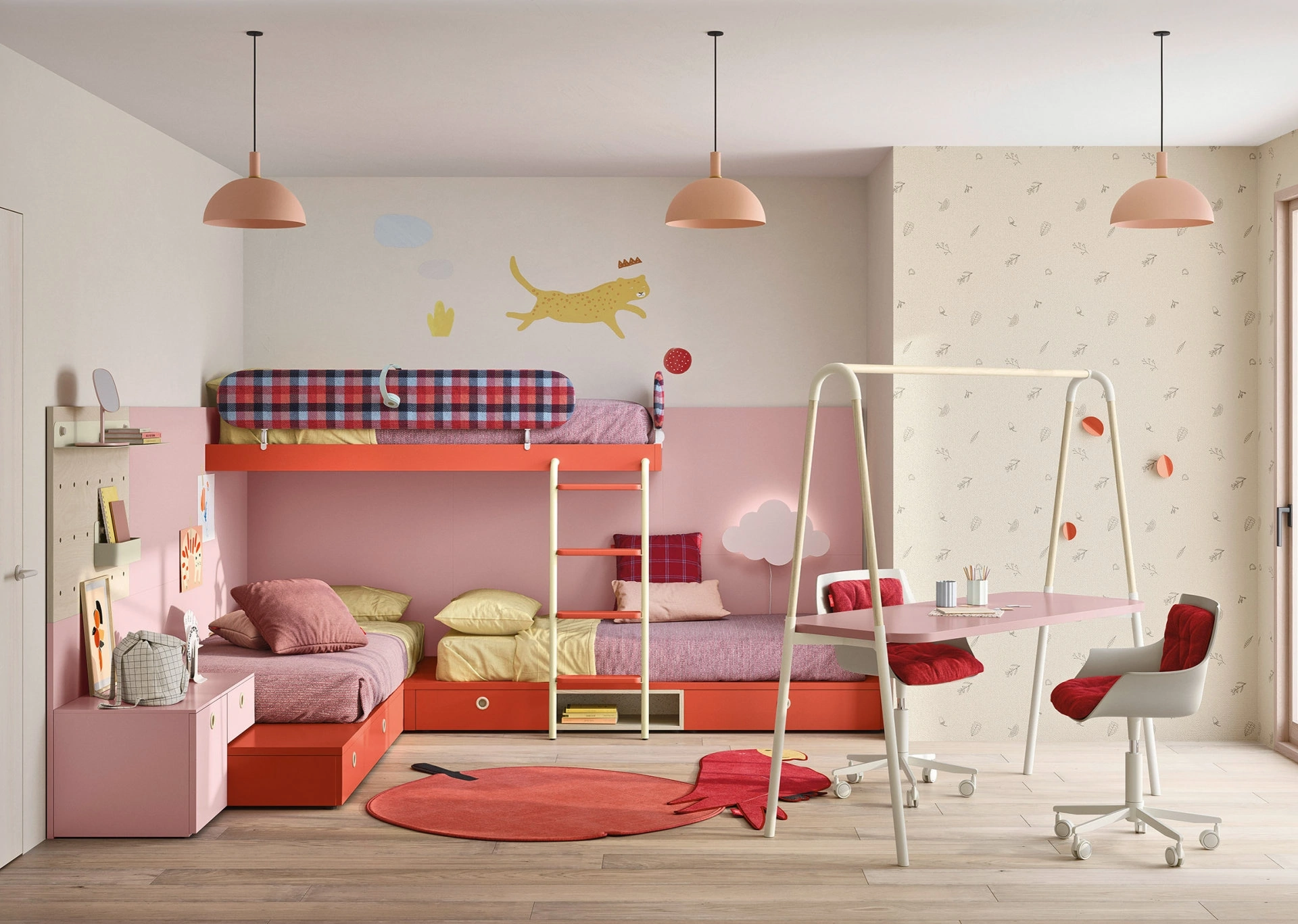 Nidi dispone di un ricco catalogo di elementi accessori da accostare su misura: troverai letto, guardaroba, scrivania, sedie e librerie. Porta valore estetico e tonalità vivaci nella stanza dedicata ai più giovani con questa soluzione, una tra le Camerette con letti a castello per bambini di Nidi. Questa soluzione in melaminico ultima alla perfezione le doti pratiche e il valore estetico della camaretta, poiché è capace di coniugare ergonomia e sicurezza. Se cerchi idee creative per arredare alla perfezione la stanza dei tuoi figli, ti proponiamo la Cameretta con letti a castello Dots di Nidi con finitura in melaminico.
