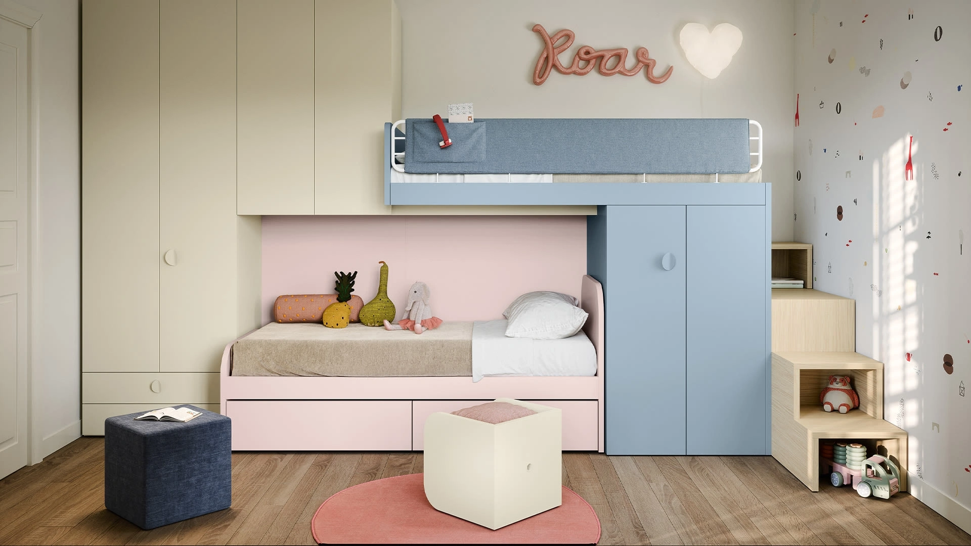 Nell'arredamento della stanza dei giovani affidati a noi: nel nostro punto vendita presentiamo tutte le più belle composizioni arredative moderne per la loro camera. Nidi dispone di una ricca gamma di elementi accessori da accostare su misura: troverai letto, armadio o cabina armadio, scrivania, sedie e librerie. Se cerchi idee creative per organizzare alla perfezione la stanza dei tuoi bambini, ti presentiamo la Cameretta con letti a soppalco di Nidi con finitura in melaminico. Porta contenuto estetico e colori vivaci nella stanza dedicata ai più piccoli con questa soluzione, una delle Camerette a soppalco per bambini di Nidi.